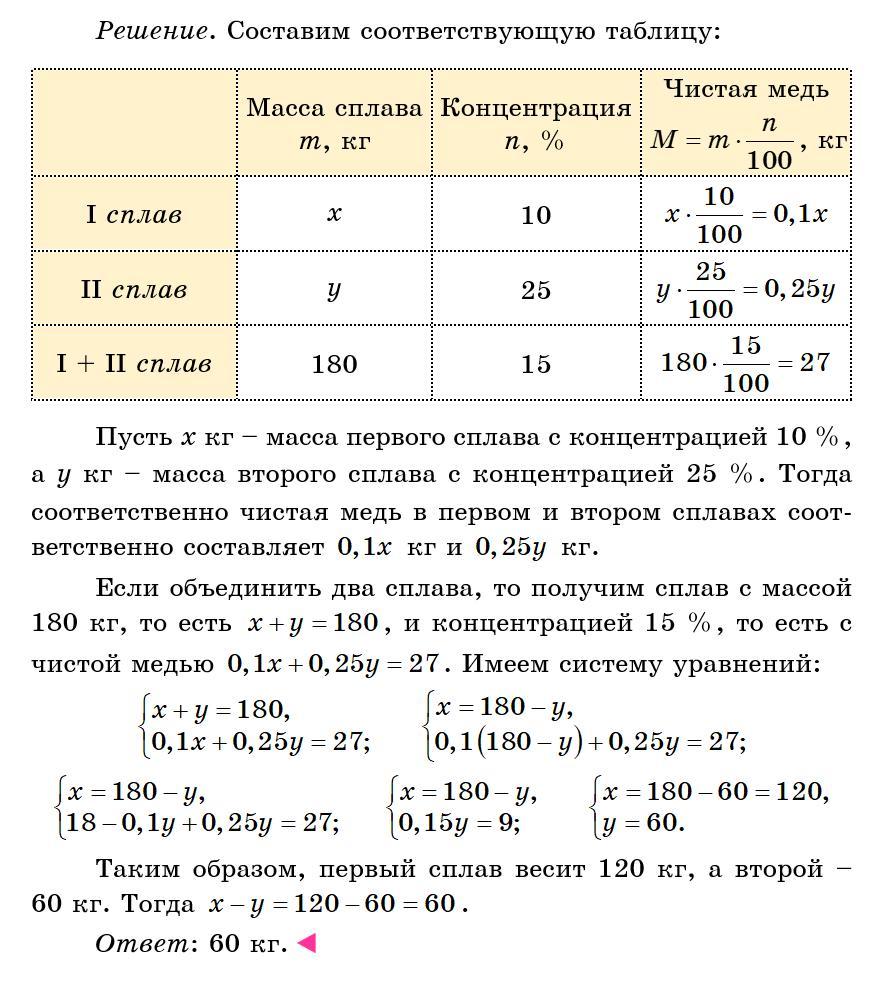 Дано 2 смеси. В первой из них концентрация меди 10 процентов. Во второй 25 процентов. Если объединить два сплава они будут весить 180 кг, с концентрацией меди 15 процентов. Найди разницу в весе первого и второго сплава.