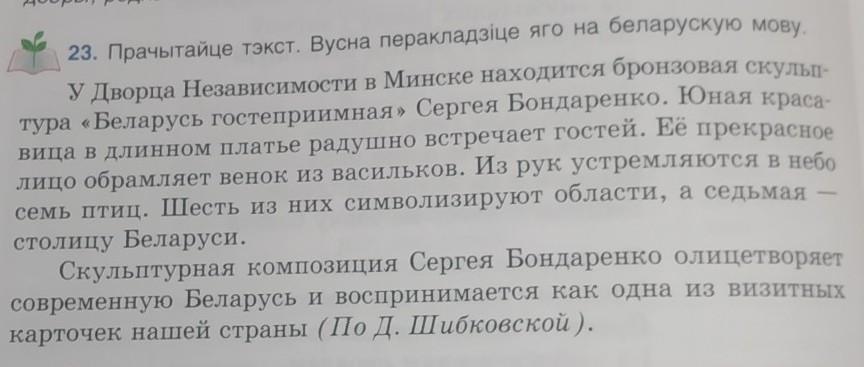 У Дворца Независимости в Минске находится бронзовая скульптура »Беларусь гостеприимная " Сергея Бондаренко. Юная красавица в длинном платье приветливо встречает гостей. Ее красивое лицо обрамляет венок из васильков. Из рук устремляются в небо семь птиц. Шесть из них символизирует области, а седьмая - столицу Беларуси. Скульптурная композиция Сергея Бондаренко олицетворяет современную Беларусь и воспринимается как одна из визитных карточек нашей страны.