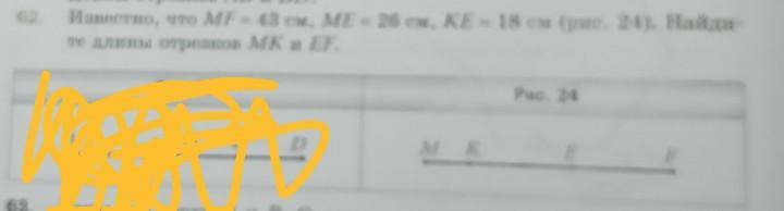 Известно, что MF=43см, МЕ=26см,КЕ=18см. Найдите длину отрезка ЕF