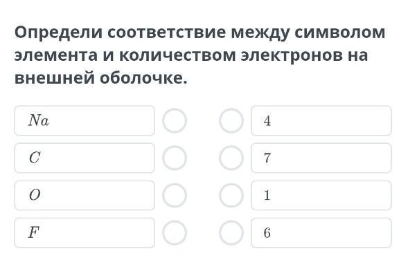 определи соответствие между символом элемента и количеством электронов на внешней оболочке