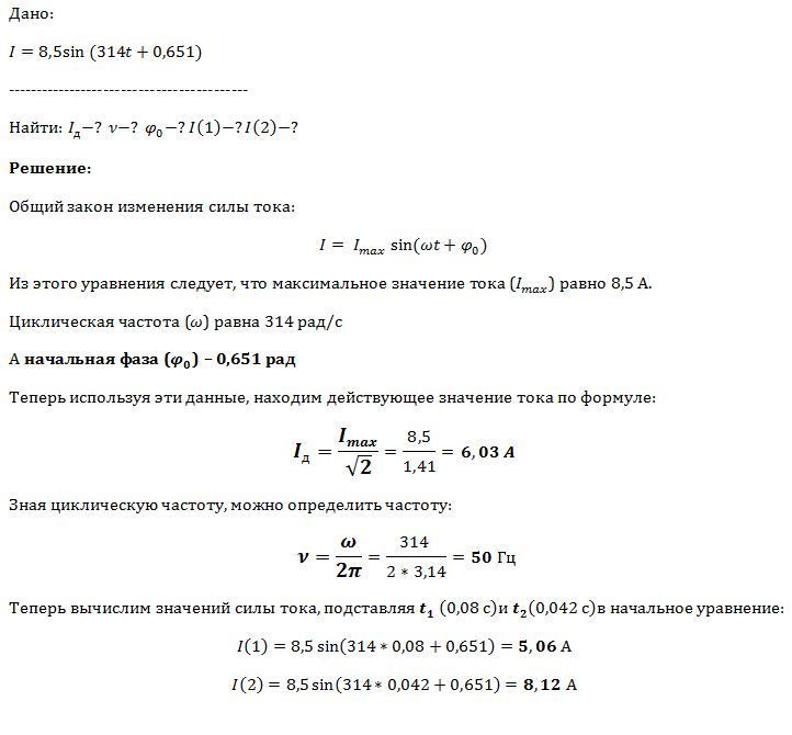 Сила тока изменяется по закону L=8,5 sin (314t+0,651).определите действующие значения тока его начальную фазу и частоту . найдите ток в цепи при t1=0,08 и t2=0,042 г