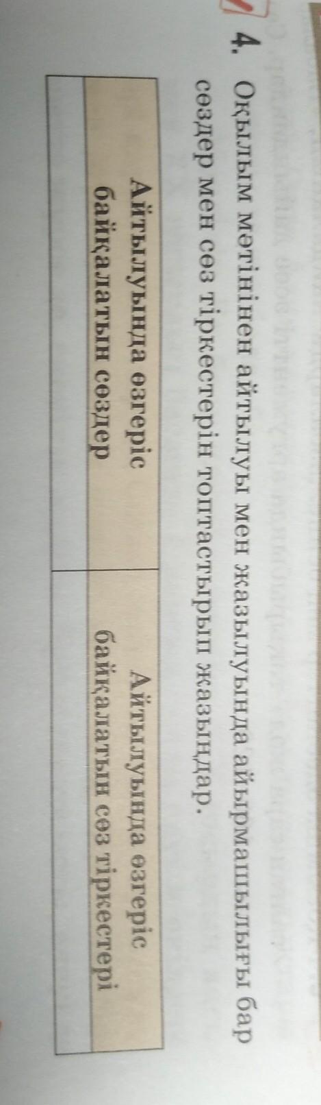 Оқылым мәтінінен айтылуы мен жазылуында айырмашылығы бар сөздер мен сөз тіркестерін топтастырып жазыңдар . Айтылуында өзгеріс сөздер Айтылуында өзгеріс байқалатын сөз тіркестері