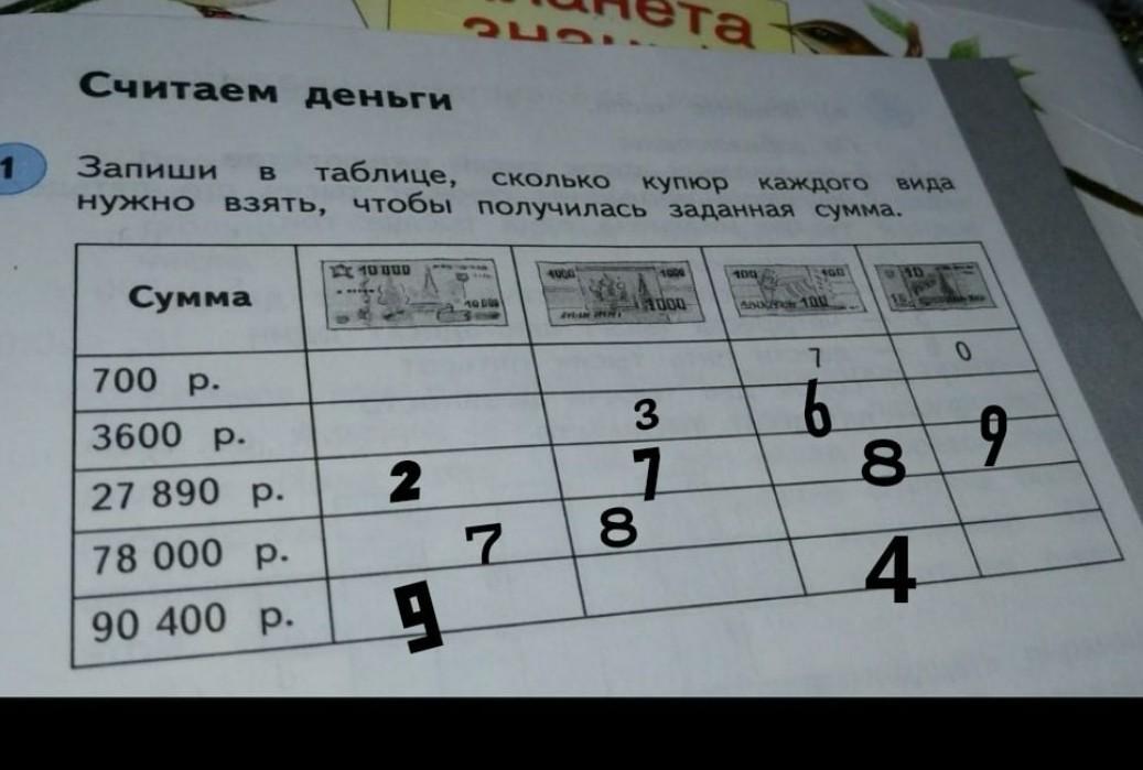 Запиши в таблице сколько купюр каждого вида нужно взять чтобы получилась заданная сумма