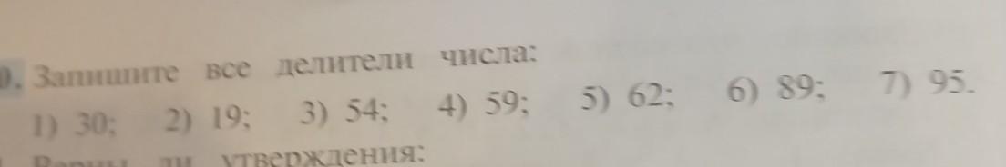 1)1, 3, 10, 5, 6, 30, 1 2)19, 1 3)1, 2, 3, 6, 9, 18, 27, 54 4)59, 1 5)1, 2, 31, 62. 6) 1, 89 7)1, 5, 19, 95