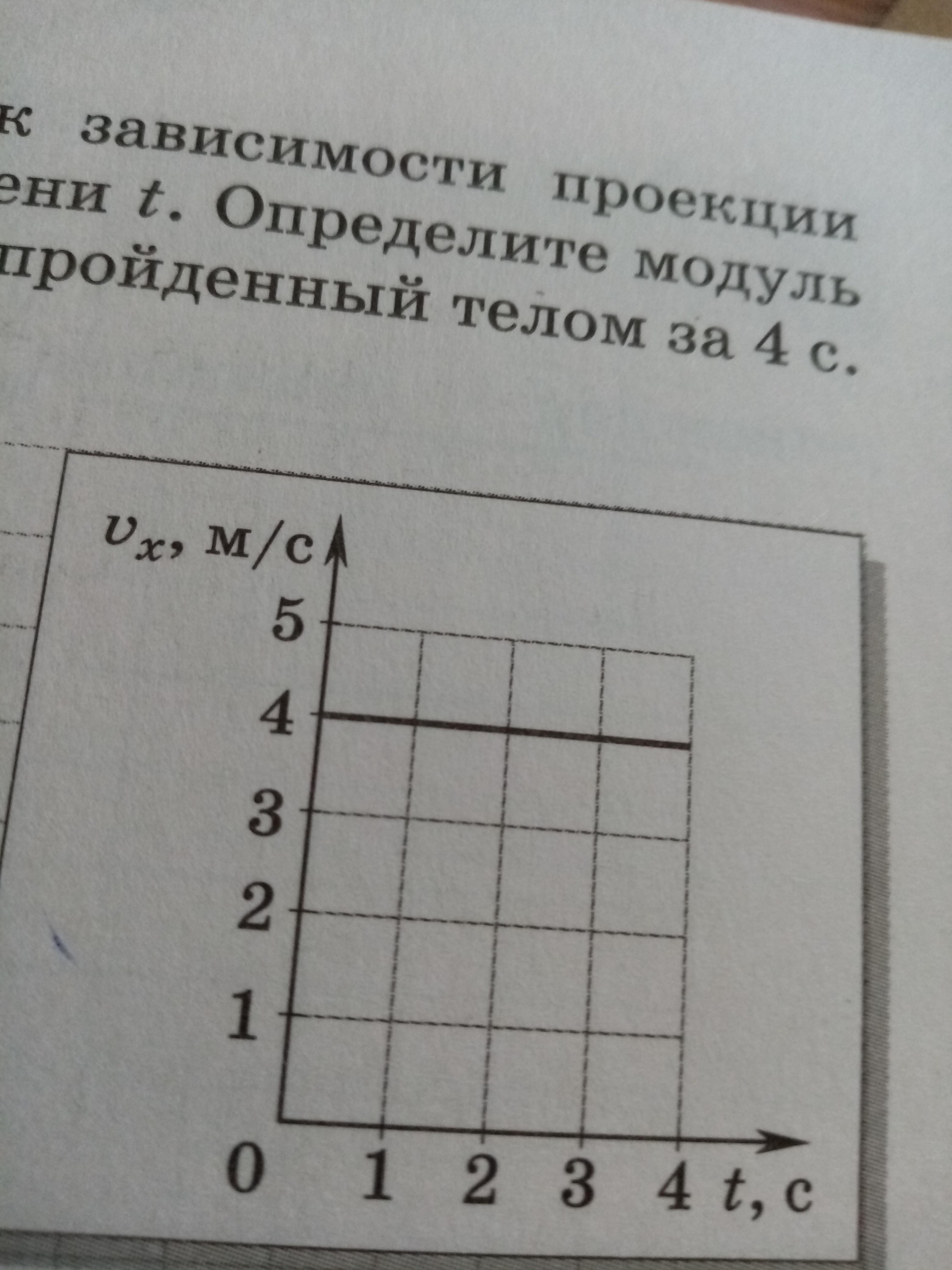 На рисунке представлен график зависимости проекции вектора скорости тела vx от времени t. Определите модуль вектора перемещения sx и путь s, пройденный телом за 4 с