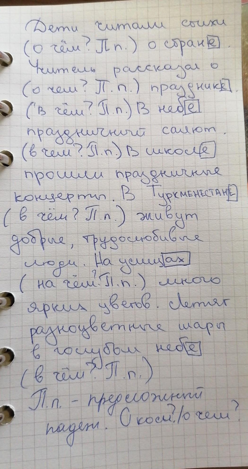 ПОЖАЛУЙСТА ПОМОГИТЕ ОПРЕДЕЛИТЬ ПАДЕЖ У ВЫДЕЛЕНЫХ СЛОВАХ. Поставьте вопросы к выделенным словам . выделити окончание, определите падеж у выделеных слов: Дети читали стихи О СТРАНЕ. Учитель рассказал О ПРАЗДНИКЕ. В НЕБЕ праздничный салют. В ШКОЛЕ прошли праздничные концерты. В ТУРКМЕНИСТАНЕ живут добрые , трудолюбивые люди. НА УЛИЦАХ много ярких цветов. Летят разноцветные шары в голубом НЕБЕ.