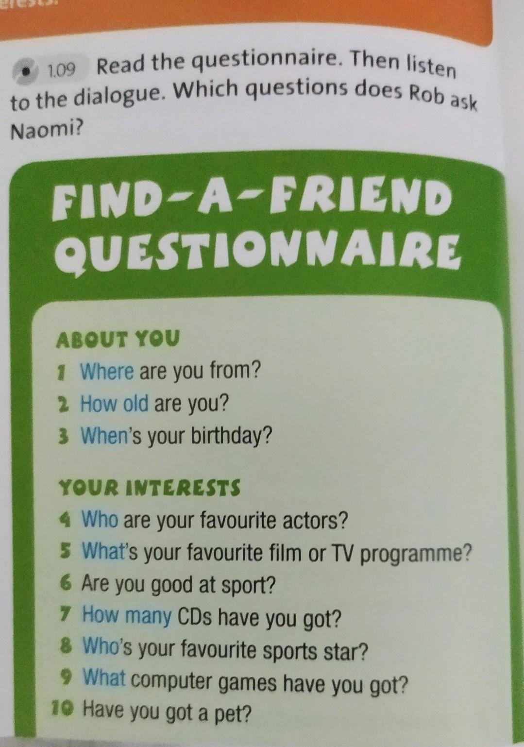 1.Откуда ты?2.Сколько тебе лет?3.Когда у тебя день рождения?__________________________4.Какие(какой)твой любимый актёр?5.Какая твою любимая ТВ программа?6.Ты хорош в спорте?7.Сколько у тебя компакт-дисков?