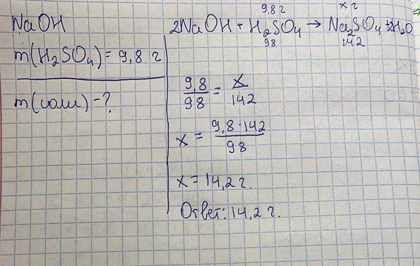 Вычислите массу соли, которая образуется при взаимодействии гидроксида НАТРИЯ с расствором СЕРНОЙ к-ты массой 9.8 грамм