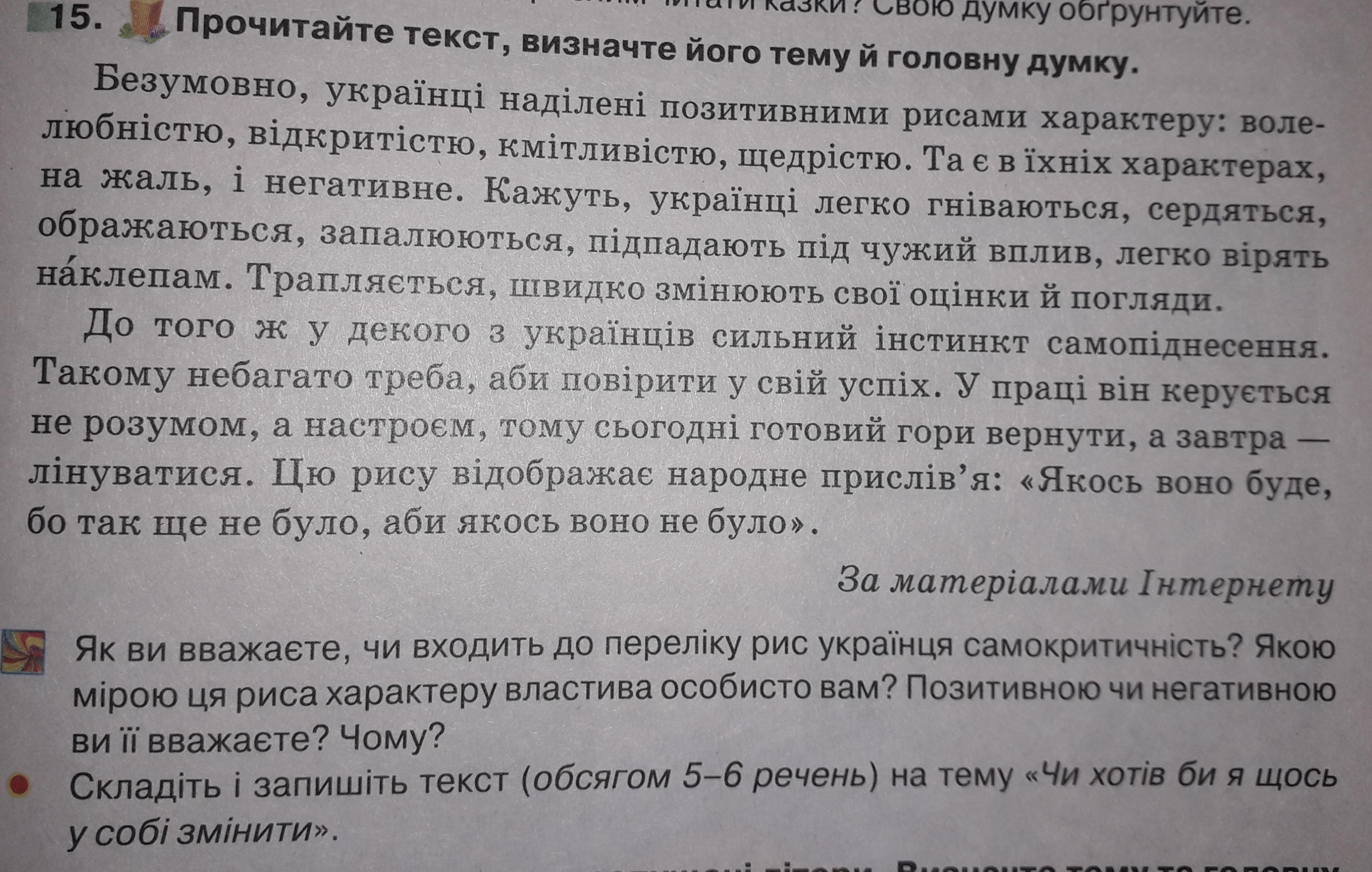 Головна думка: Розказати про позитивні та негативністорони уукраїнського характеру