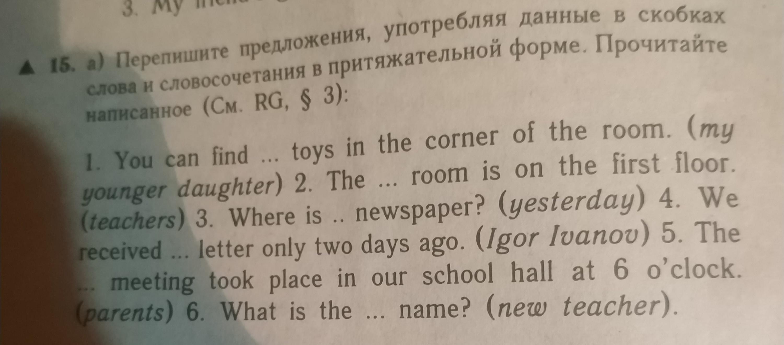 перепишите предложения,употребляя данные в скобках слова и словосочетания в притяжательной форме. 1. You can find ... toys in the corner of the room. (my younger daughter) 2. The ... room is on the first floor. (teachers) 3. Where is .. newspaper? (yesterday) 4. We received ... letter only two days ago. (Igor Ivanov) 5. The.... meeting took place in our school hall at 6 o'clock. (parents) 6. What is the ... name? (new teacher).
