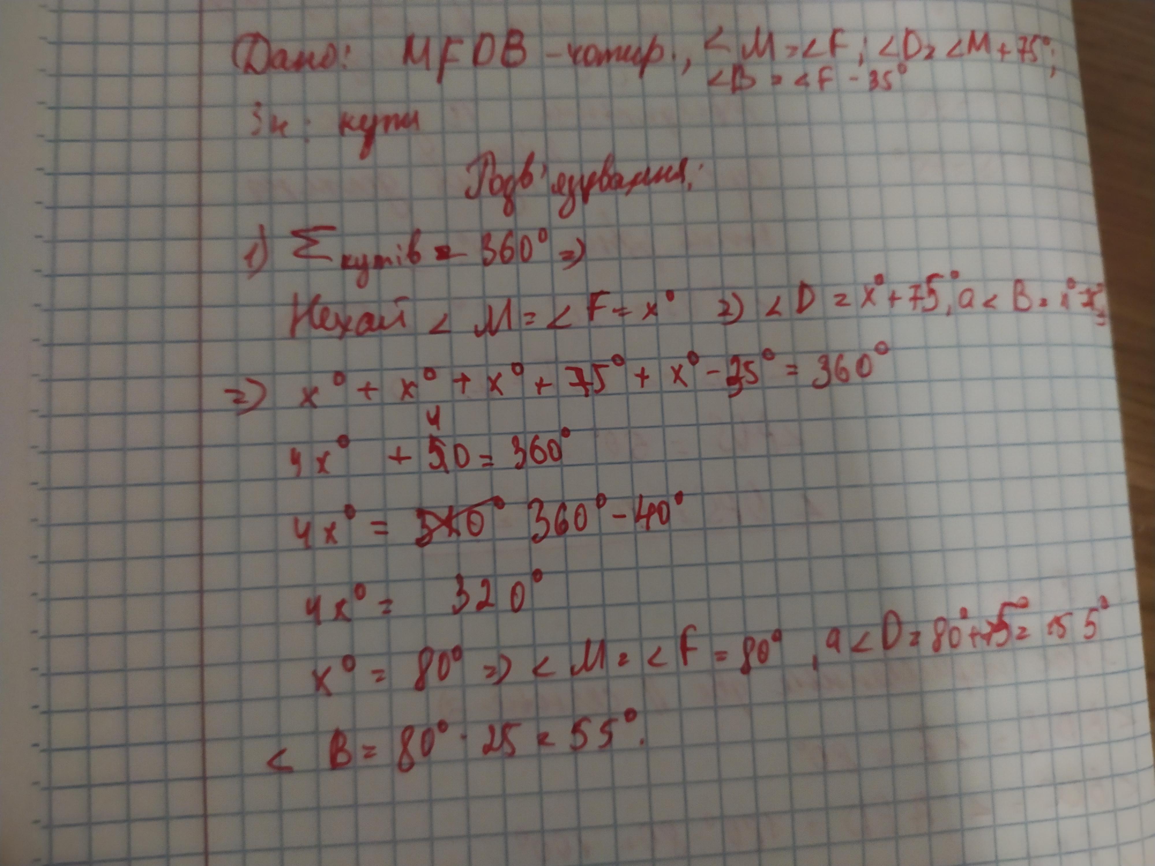 Знайди кути чотирикутника MFDB, якщо <М=<F, кут D більший за кут М на 75°,а кут B менший за кут F на 35°