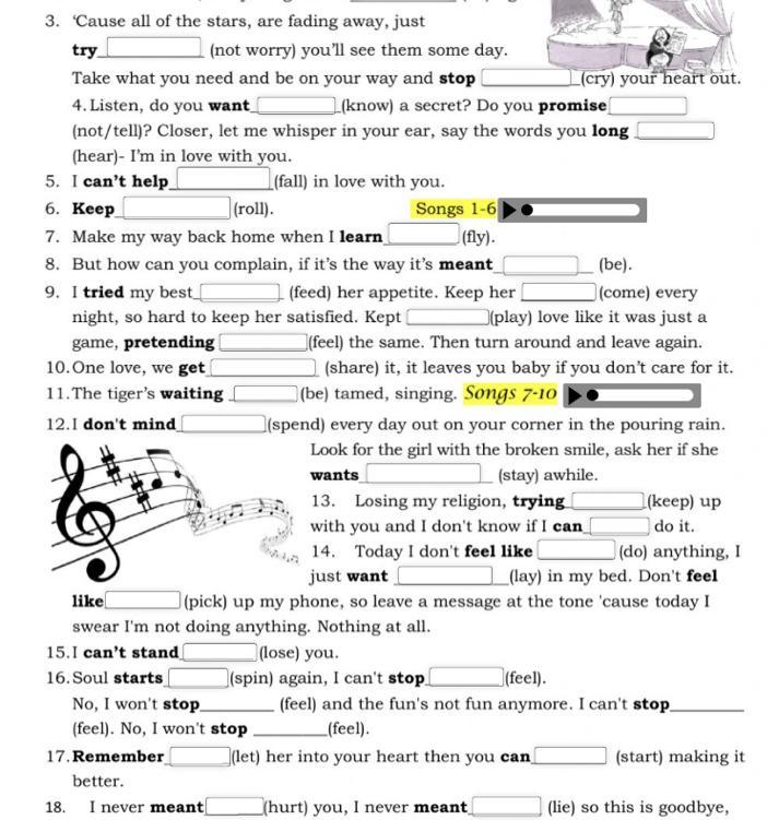 пожалуйста помогите! Тема GERUNDS AND INFINITIVES in songs, 8 класс! Фото прикрепленно!