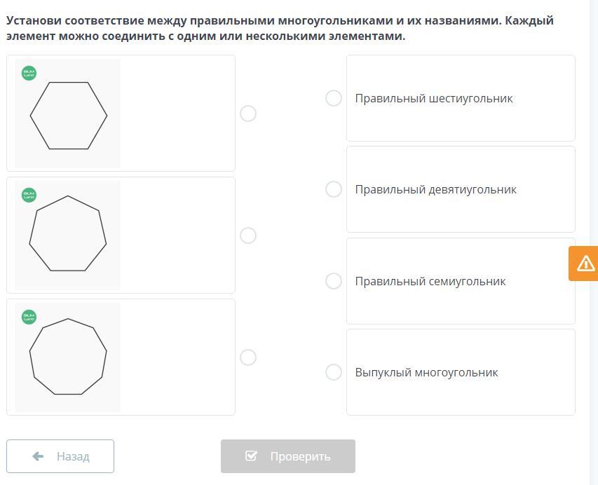 Установи соответствие между правильными многоугольниками и их названиями. Каждый элемент можно соединить с одним или несколькими элементами.