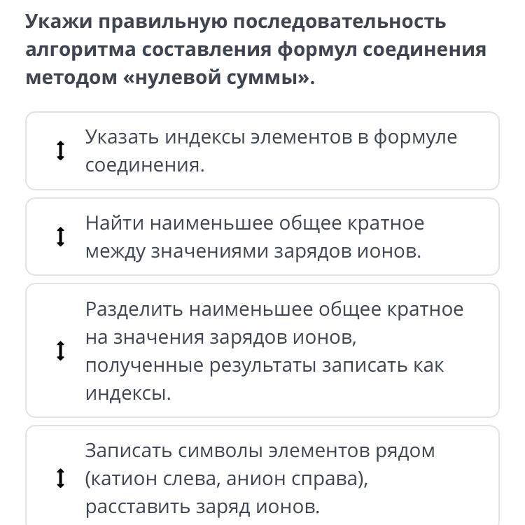 Укажи правильную последовательность алгоритма составления формул соединения методом «нулевой суммы».