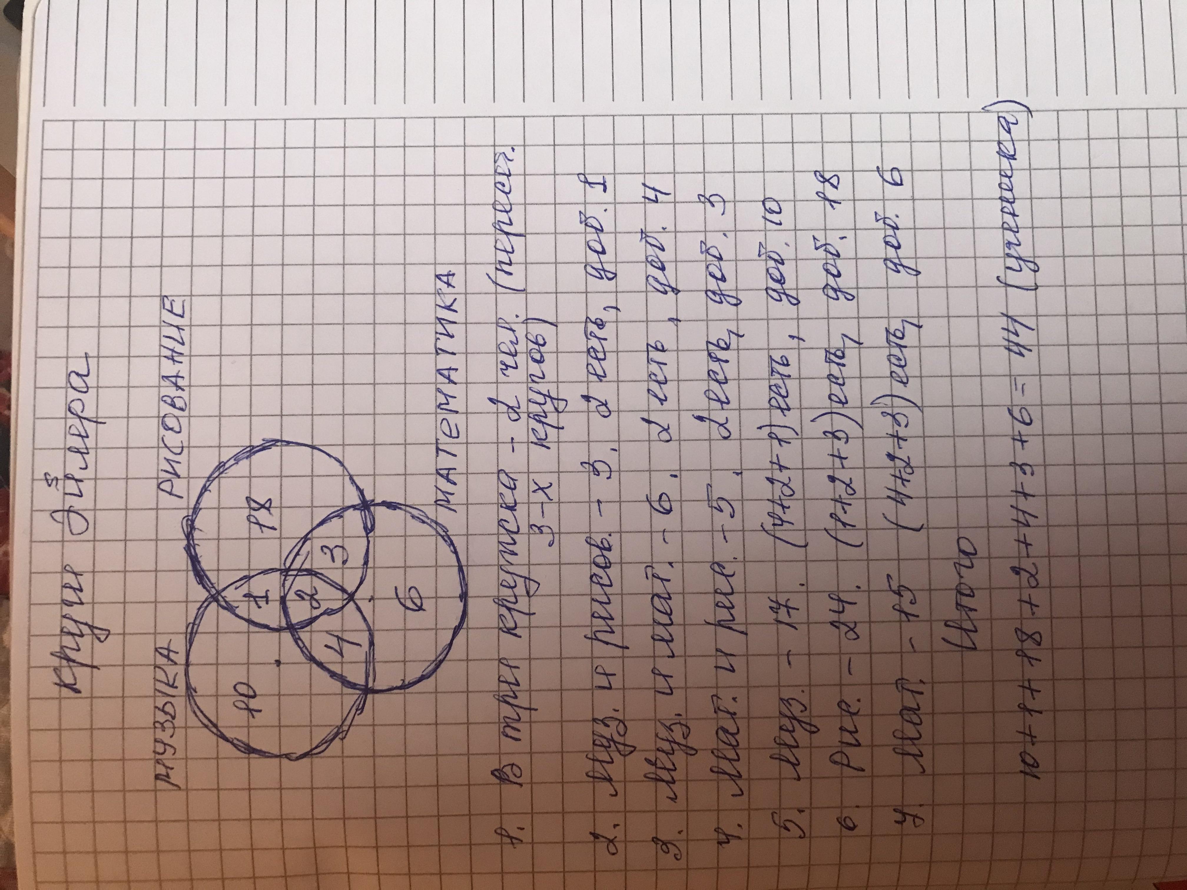 В школе работают кружки по музыке, рисованию и математике. На кружок по музыке ходит 17 шестиклассников, по рисованию – 24, по математике – 15. При этом каждый шестиклассник ходит хотя бы в один кружок, а на три кружка сразу ходят двое. На кружок по музыке и рисованию одновременно ходят 3 шестиклассника, по музыке и математике - 6, а по математике и рисованию – 5 (причем посчитаны и те шестиклассники, которые ходят на все три кружка сразу). Сколько шестиклассников в школе?