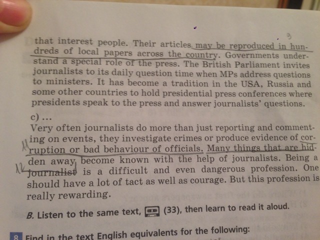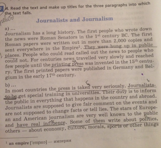 1) … …. У журналистики есть долгая история. Первые люди, которые записали новости, были римскими сенаторами в 1-ом столетии до н.э. Первые римские газеты были выписаны больше чем в 2,000 копий и посланы всюду в Империи. Они повесились в общественных местах. Люди, которые могли читать, вызвали новости людям, которые не могли. В течение многих столетий новости ехали очень медленно и достигали немногих людей, пока печатная машина не была изобретена в 15-ом столетии. Первые печатные работы были опубликованы в Германии и Бельгии в начале 17-ого столетия 2) … ….. В большинстве стран к прессе относятся очень серьезно. Журналисты – к – быть получают специальную подготовку в университетах. Их обязанность состоит в том, чтобы сообщить общественности во всем, что происходит в стране и за границей. Журналисты, как предполагается, дают ярмарку, комментируют события и, как предполагается, не изменяют факты или говорят неправду. Звезды европейца и американская журналистика очень хорошо известны общественности и имеют реальное влияние. Некоторые из них пишут о политике, других – об экономике, культуре, нравах, спортивных состязаниях или других вещах тот интерес люди. Их статьи могут быть воспроизведены в сотнях местных газет по всей стране. Правительства понимают специальную роль прессы. Британский Парламент приглашает журналистов в свое ежедневное время для вопросов, когда члены парламента адресуют вопросы к министрам. Это стало традицией в США, России и некоторых других странах, чтобы провести президентские пресс-конференции, где президенты говорят с прессой и отвечают на вопросы журналистов. 3) … Очень часто журналисты делают больше, чем просто сообщение и комментарий событий, они исследуют преступления или производят доказательства коррупции или плохое поведение чиновников. Много вещей, которые скрыты, становятся известными с помощью журналистов. Быть журналистом является трудной и даже опасной профессией. нужно иметь много такта так же как храбрости. Но эта профессия действительно полезна.