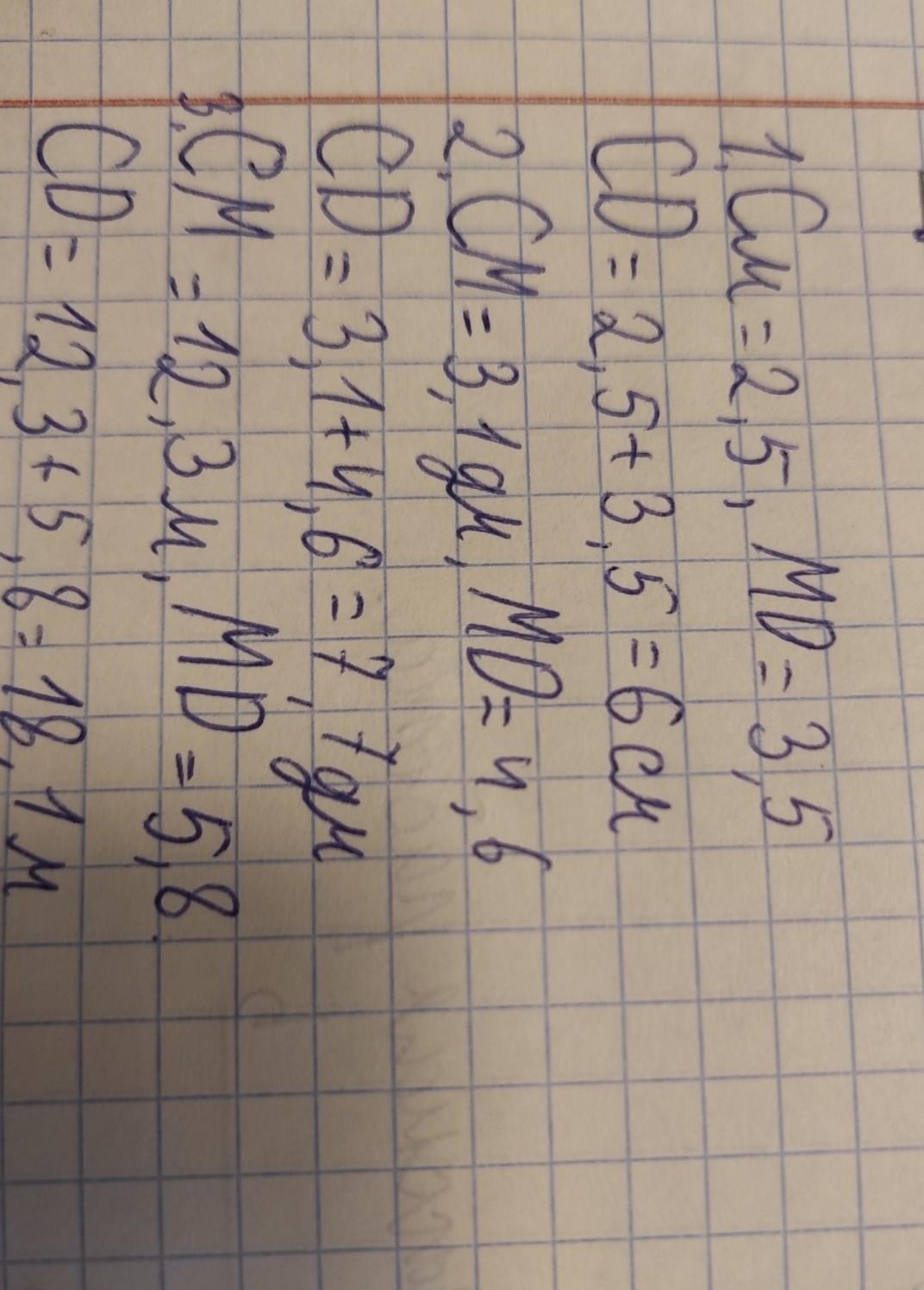 Точка М лежит на прямой CD между точками C и D. Найдите длину отрезка CD, если : 1)CM=2,5см, MD=3,5см ; 2)CM=3,1дм, MD=4,6дм ; 3)CM=12,3м, MD=5,8м
