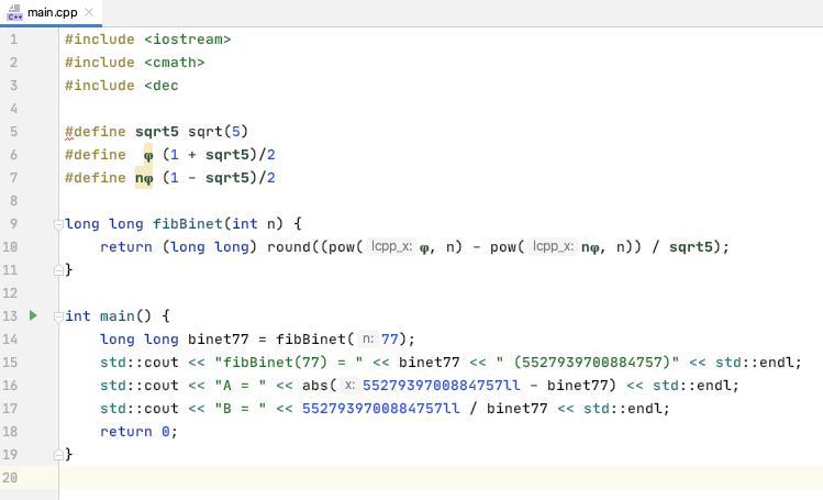 - std::cout << "A = " << abs(5527939700884757ll - binet77) << std::endl;