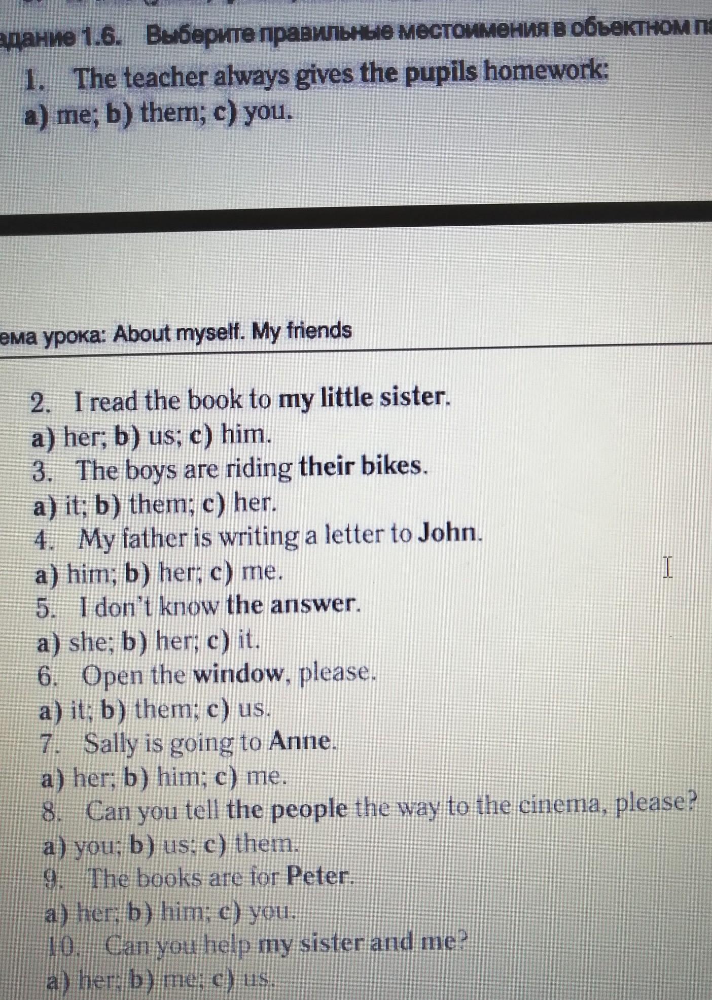 2)her 3)them 4)him 5)it 6)her 8)them 9)him 10)us