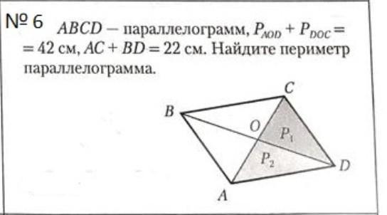 За умовою задачі Раод+Рдос=42 см а сума довжин діагоналей АС+ВД=22 см складемо рівняння: Р1=АД+АО+ОД
