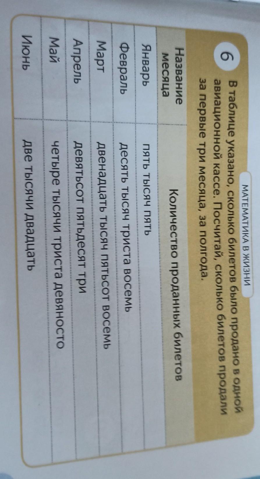 в таблице указано Сколько билетов было продано в одной авиационной кассе Посчитай сколько билетов продали за первые три месяца за полгода