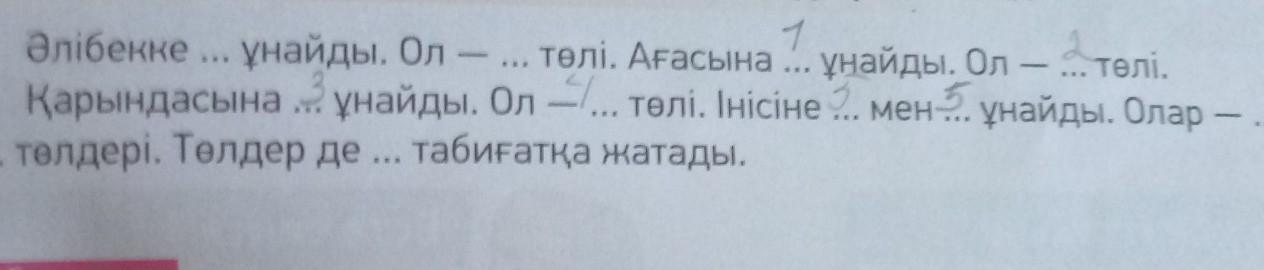 Әлібекке бұзау ұнайды. Ол - сиырдың төлі. Ағасына құлын ұнайды. Ол - жылқың төлі. Қарындасына бота ұнайды. Ол - түйенің төлі. Інісіне қошақан мен лақ ұнайды. Ол - қой ешкі төлдері.