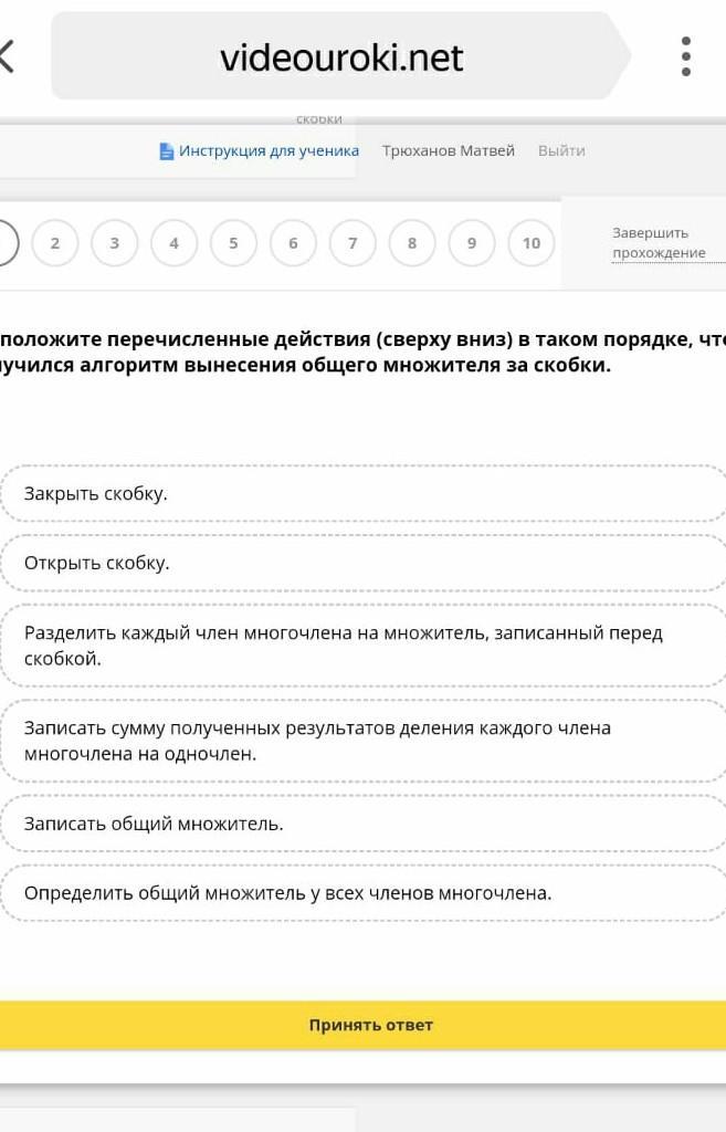 4) разделить каждый член многочлена на множитель, записанный перед скобкой