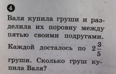 валя взяла груши и разделила их поровну между своими пятью своими подругами каждой досталось по 2 целых 3/5 груши сколько грушь купила валя