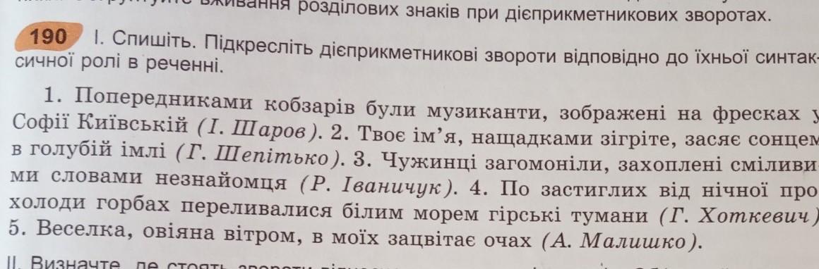 Дієприкметникові звороти: зображені на фресках у Софії Київській; нащадками нагріте; захоплені сміливими словами незнайомця; овіяна вітром; по застиглих від нічної прохолоди горбах.