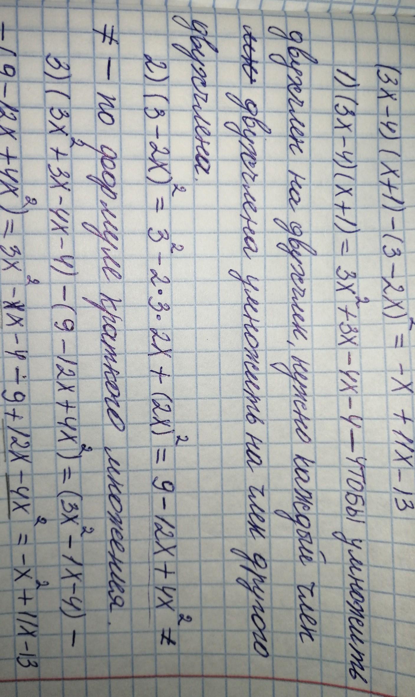 3х²+3х-4х-4-(9-2*3*2х+4х²)=3х²+3х-4х-4-9+12х-4х²= -х²+11х-13