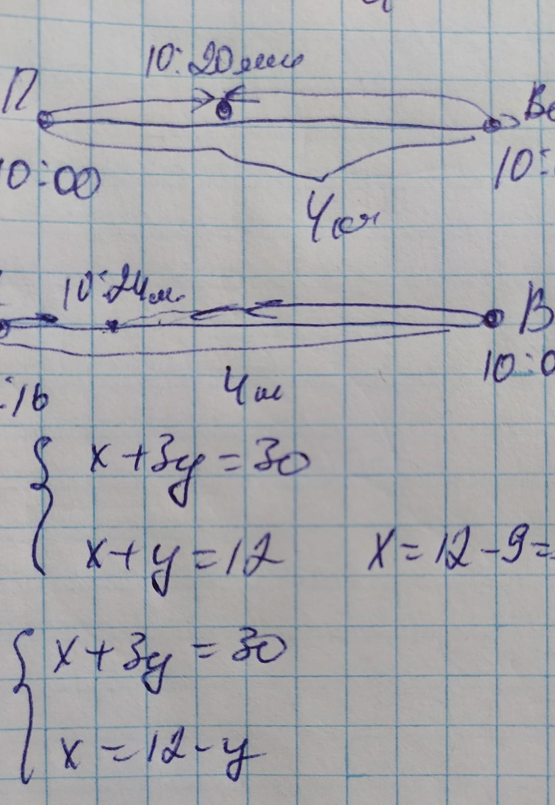 Так как на следующий день они встретились в 10:24, велосипедист, выехавший в 10:00 потратил на дорогу 24минуты=24/60часа, а пешеход, вышедший в 10:16 пришёл к месту встречи в 10:24, поэтому он шёл 10:24–10:16=00:8 минут=8/60часа. Поэтому пешеход за 8 минут прошёл 8/60×х км, а велосипедист проехал 24/60×у км, и зная что общее расстояние составляет 4км, составим второе уравнение: 8/60×х+24/60×у=4