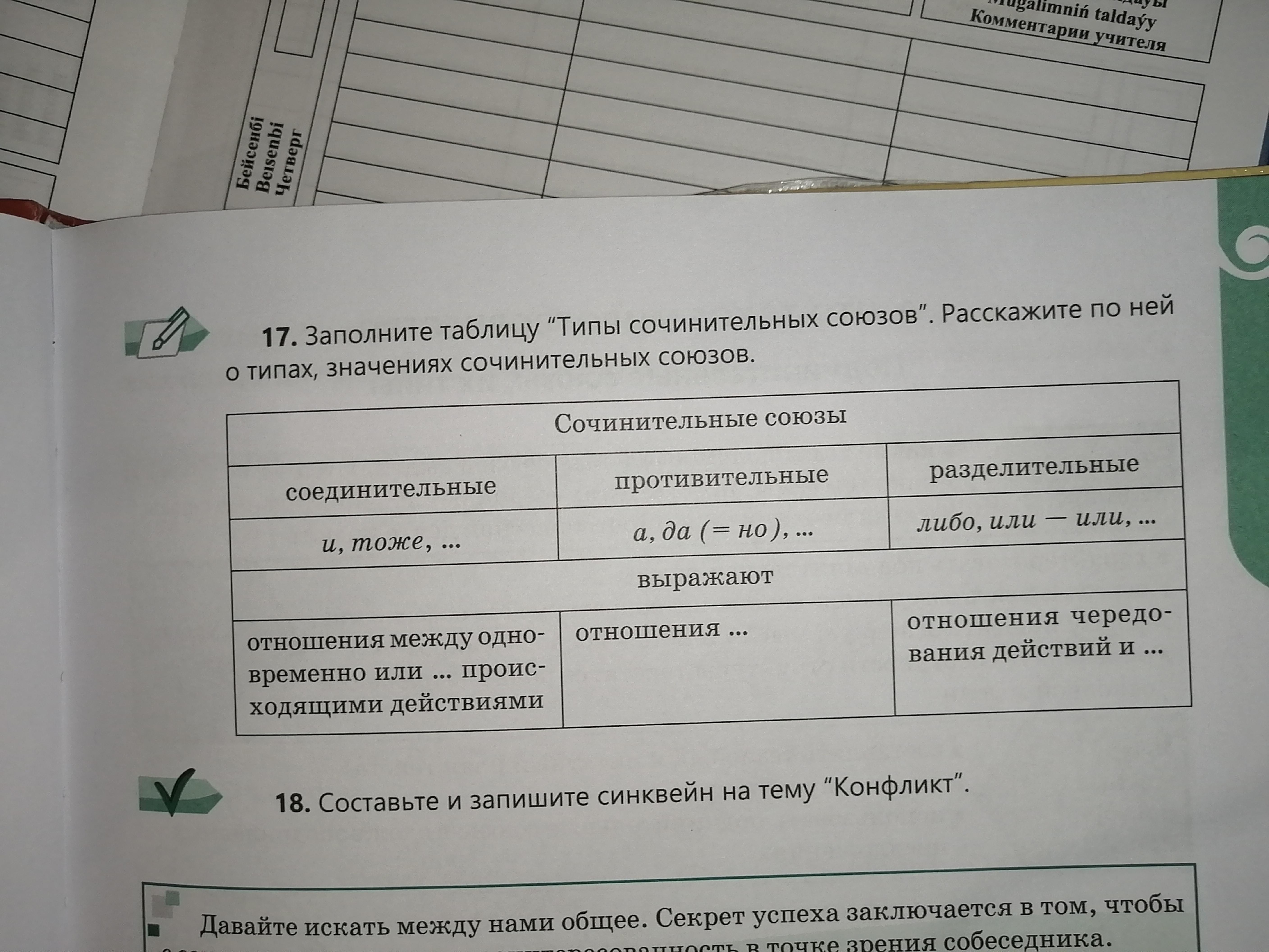 17. Заполните таблицу "Типы сочинительных союзов". Расскажите по ней