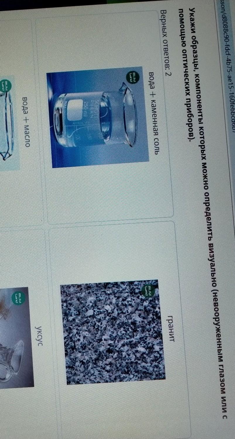укажи образцы компоненты которого можно определить визуально невооружённым глазом или с помощью оптических приборов vodaplus камисоль гранит вода плюс масло и уксус