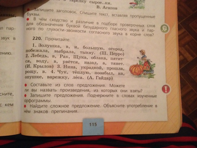 Золушка побежала в огород и выбрала большую тыкву. Лебедь рвется в облака, Рак пятится назад, а Щука тянет в воду. Нина прошла украдкой в рощу. Чук позабыл теплую варежку на опушке леса.