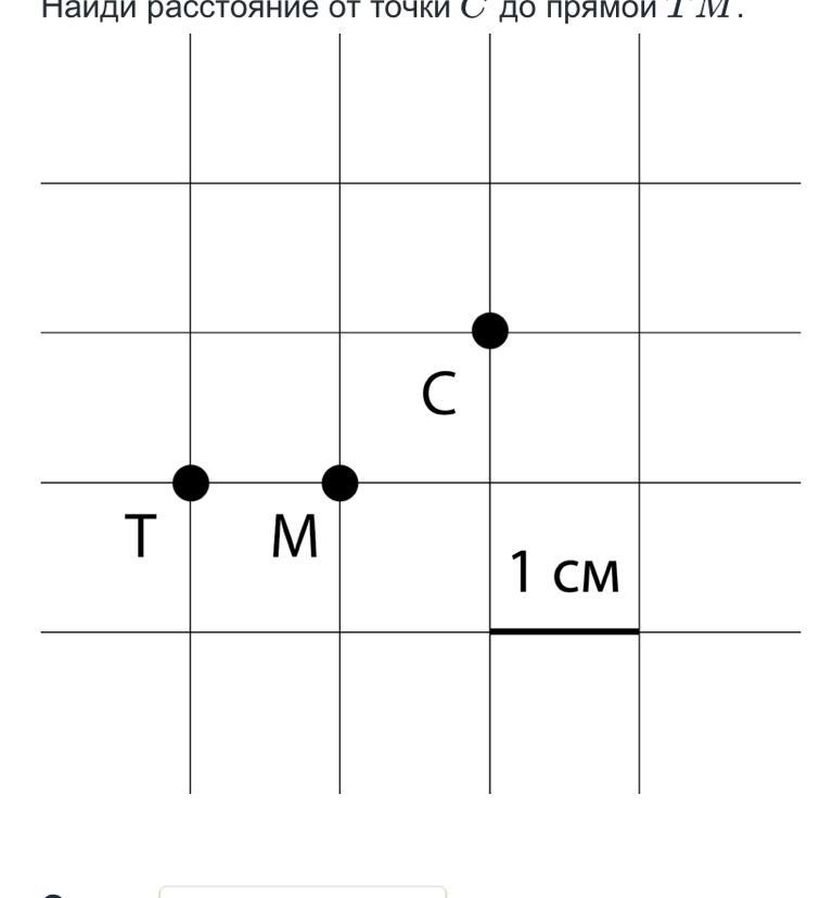 Расстояние от точки до прямой равно длине перпендикуляра от точки С до прямой ТМ, это ровно одна клетка, т.е. 1 см.