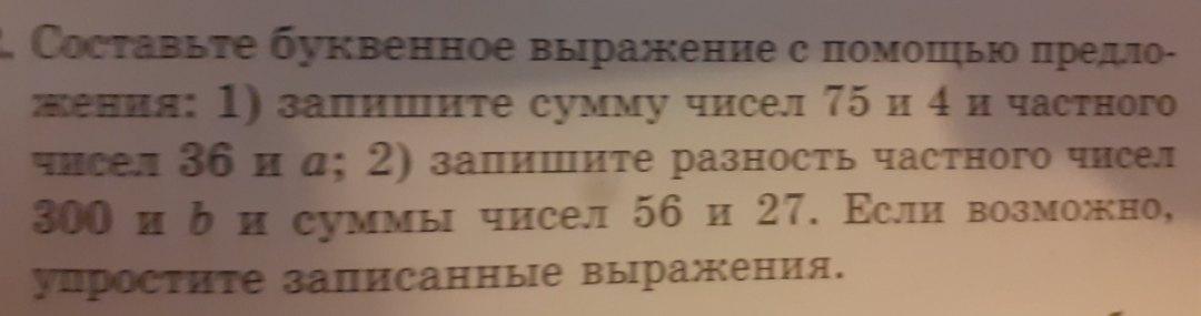 Запишите сумму чисел 75 и 4 и частного чиснл 36 и а. Запишите разность частного чисел 300 и б и суммы чисел 56 и 27. Если возможно упростите записанные выражения.