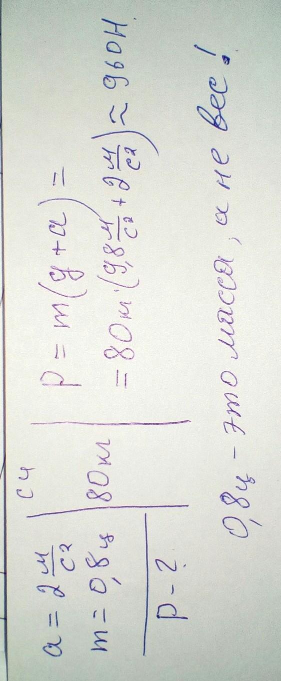 Найди вес тела мальчика, едующего в лифте вверх, если ускорение лифта 2м/с, а вес мальчика 0,8центнеров