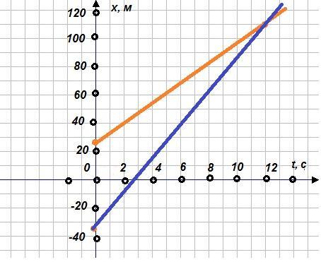 Помогите пожалуйста!!! Собака біжить за велосипедистом прямолінійною ділянкою шосе. Рух велосипедиста описується рівнянням xl = 25 + 7t , а рух собаки — рівнянням х2 = -35 + 12t . Опишіть обидва рухи (укажіть тип кожного руху і значення величин, що його характеризують, побудуйте графіки рухів. Чи наздожене собака велосипедиста? Якщо наздожене, то коли і де це відбудеться?