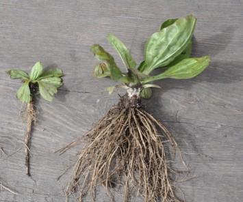 ПОДОРОЖНИК: нет главного корня (отсюда делаем вывод, что у него мочковатая корневая система), он имеет короткое корневище, усаженное тонкими нитевидными корнями