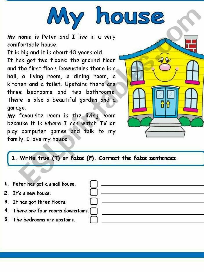 My name is Peter and I live in a very comfortable house. It is big and it is about 40 years old. It has got two floors: the ground floor and the first floor. Downstairs there is a hall, a living room, a dining room, a kitchen and a toilet. Upstairs there are three bedrooms and two bathrooms. There is also a beautiful garden and a garage. My favourite room is the living room because it is where I can watch TV or play computer games and talk to my family. I love my house…