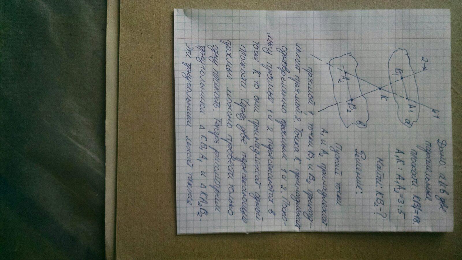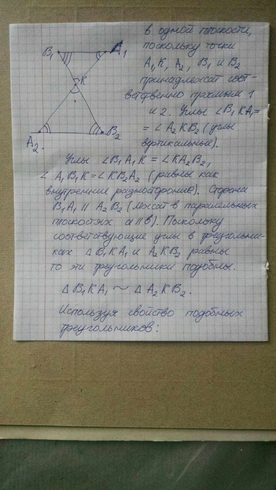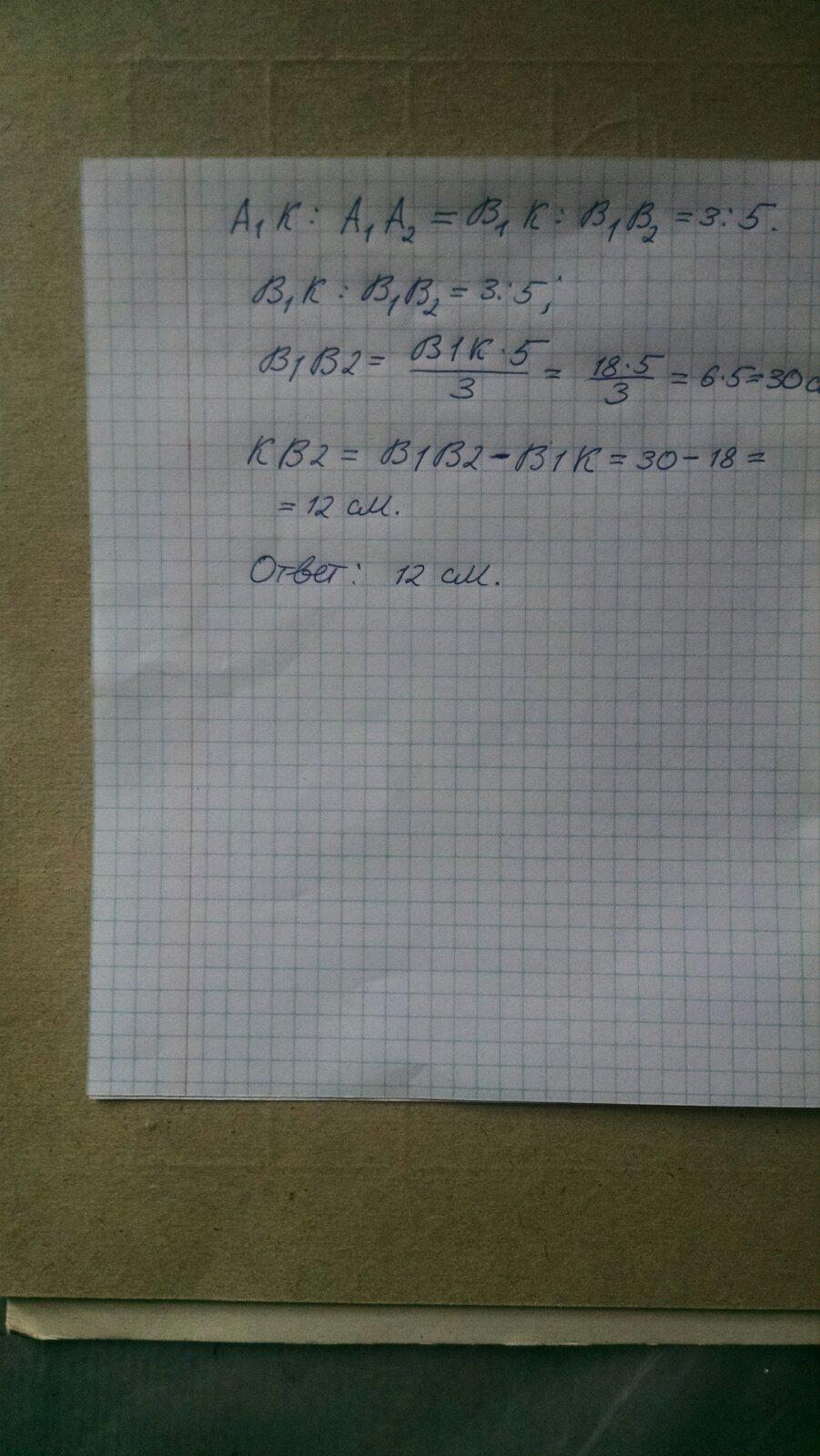 Точка К лежит между параллельными плоскостями а и b. Прямые, проходящие через точку К, пересекают плоскость а в точках А1 и B1, а плоскость b в точках А2 и В2 соответственно. Найдите КВ2, если А1К: А1, А2=3:5, КВ1 = 18см