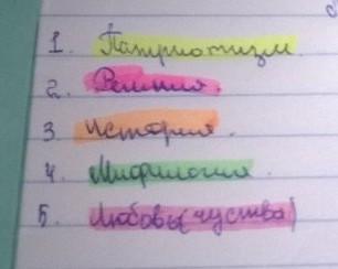 Записать в тетради по 2 классических произведения(музыкальных) на каждую из "вечных" тем.(по картинке) (патриотизм, религия, история, мифология, любовь)