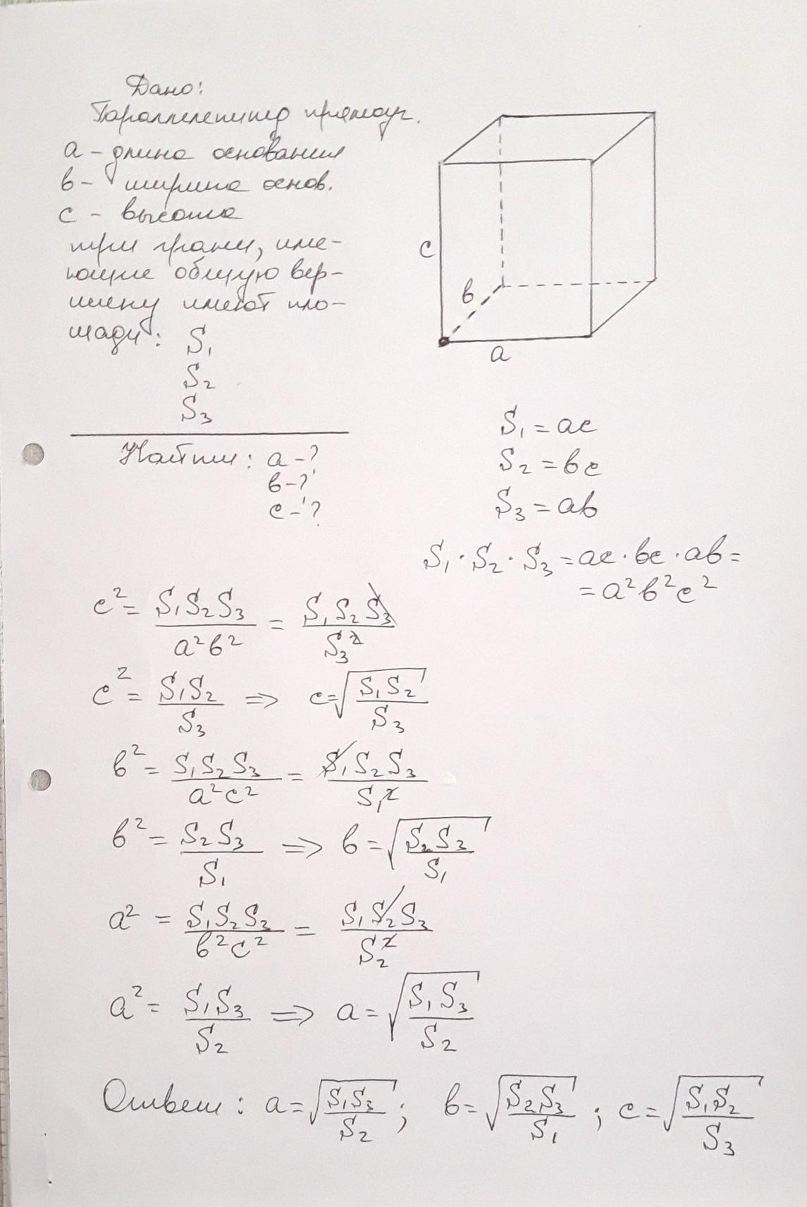 Площади трёх граней прямоугольного параллелепипеда ,имеющих общую вершину, равны s1, s2, s3. Найдите рёбра параллелепипеда.