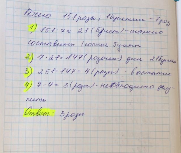 В цветочный магазин закупили некоторое количество роз. Сколько роз нужно закупить к 151 роз(-ам, -е), чтобы из этих цветов можно было составить букеты из 7 роз?