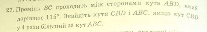 ПРОШУ ПОМОГИТЕ ДАЮ 50 БАЛОВ!!!! 27. Промінь ВС проходить между сторонами кута АBD, Який дорівнюэ 115 °. Знайдіть кути СВD i ABC, если кут СВD у 4 рази більшій за кут АВС.