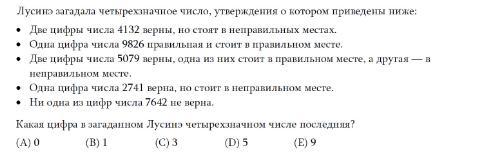 При этом: 9 - стоит на первом месте по второму условию, 1 не стоит на последнем по четвёртому, 0 стоит на втором месте по третьему условию. Следственно, ответ - (С) 3, а все число - 9013.