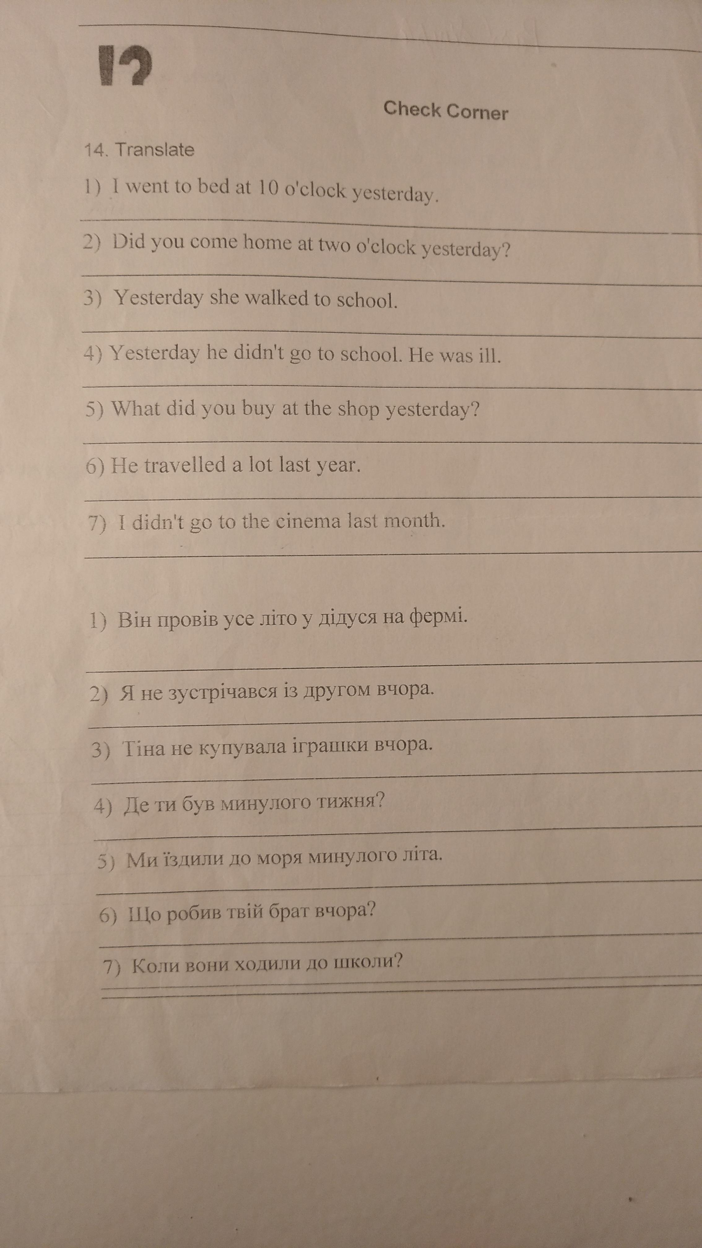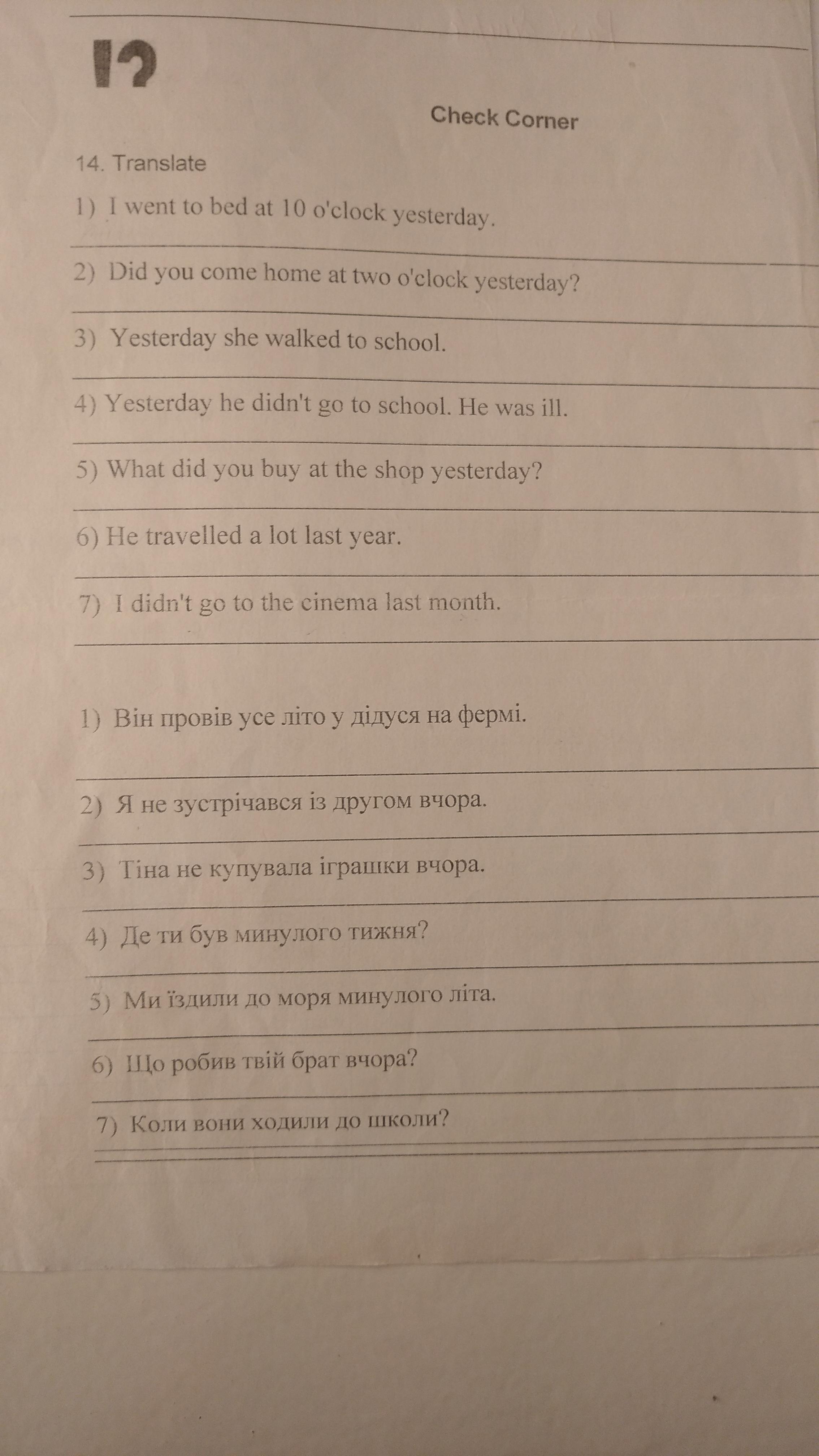 Ответ:1) Я вчора лягла спати о 10 годині. 2) Ти прийшов додому о другій годині вчора? 3) Вчора вона гуляла до школи. 4) Вчора він не ходив до школи. Він був іл. 5) Що ви купили в магазині вчора? 6) Торік він багато подорожував. 7) Я не ходив у кіно минулого місяця.