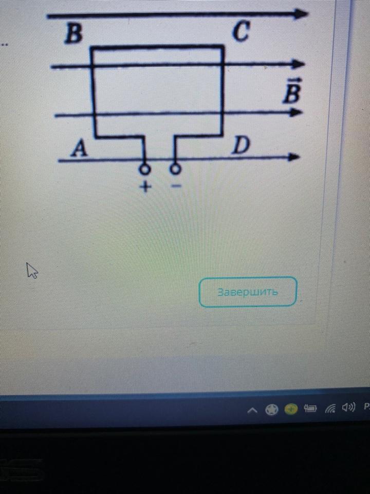 На рисунке изображена рамка с током в магнитном поле. На сторону АВ действует сила Ампера направленная перпендикулярно ... 1. Стороне рамки АВ вправо 2. Плоскости рисунка от нас 3. Стороне рамки АВ влево 4. Плоскости рисунка к нам
