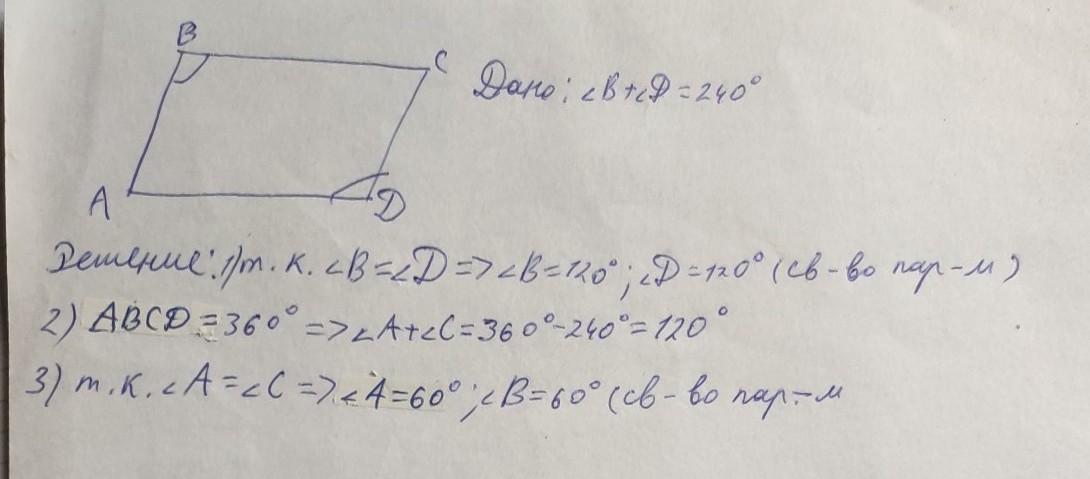 Так как сумма углов, прилежащих к одной стороне параллелограмма, равна 180°, то два угла из условия противоположны. Но противоположные углы в параллелограмме равны, следовательно каждый из них равен 240°:2=120°. А значит, опять же потому что сумма углов, прилежащих к одной стороне, равна 180°, оставшиеся два угла равны по 180°-120°=60°