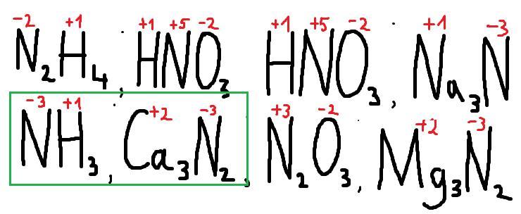 Степень окисления -3 атом азота проявляет в каждом из двух веществ, формулы которых: а) N2H4, HNO3; б) NH3, Ca3N2; в) HNO3, Na3N; г) N2O3, Mg3N2. Можно с пояснением?